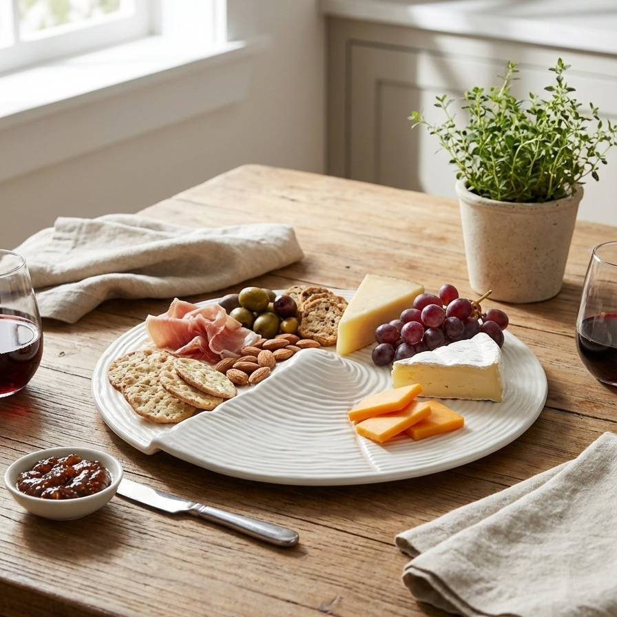 Style tip: Create a visual gradient: start with cheeses or mains along the crest, then layer crackers, fruit, and nuts towards the edge for a full, photo‑ready spread.