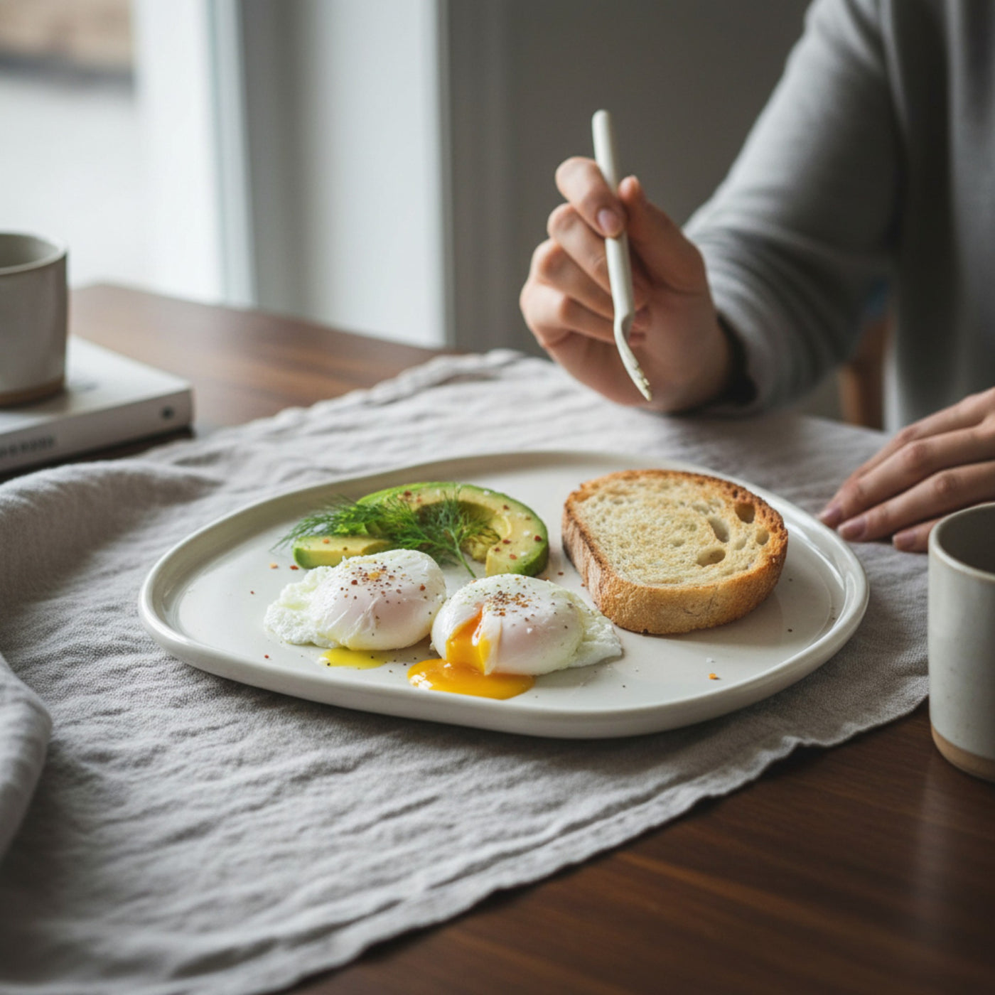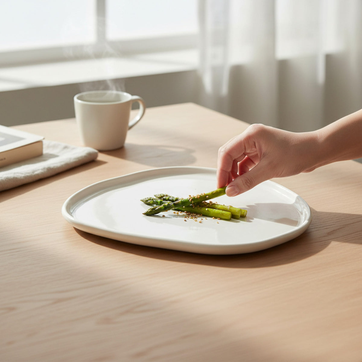 Style tip: Build a relaxed, gallery‑style plate by grouping foods in distinct zones—place your main (like grilled asparagus or fish) slightly off‑centre, then add a small cluster of grains or salad and finish with a sprinkle of seeds or herbs to highlight the plate’s negative space.