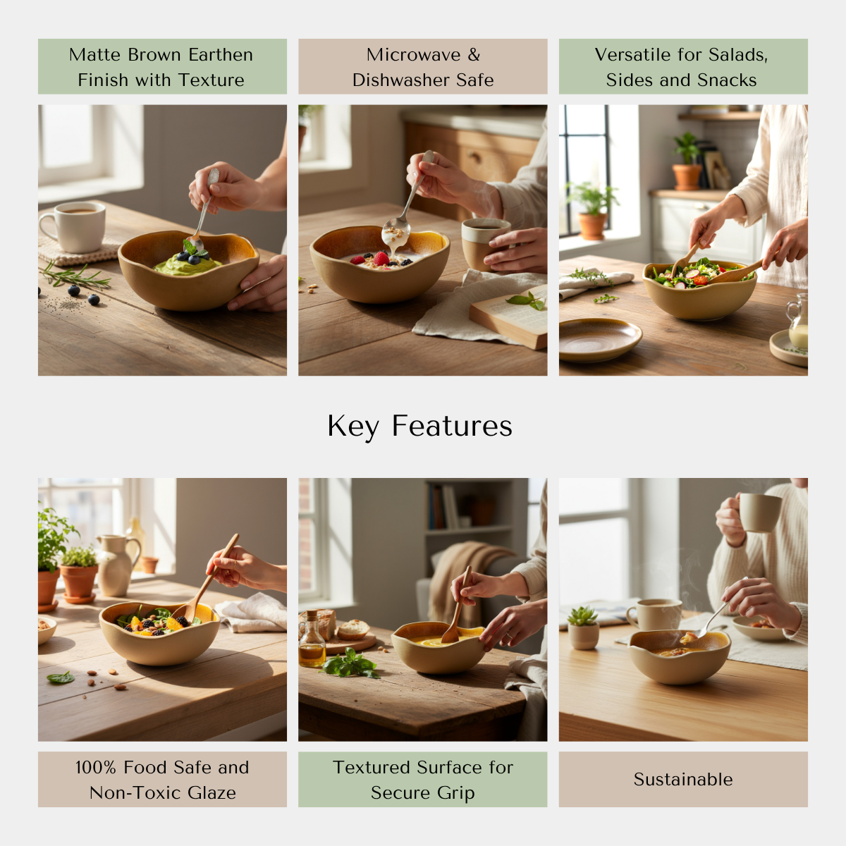 Embrace the natural elegance of the Desert Earth Serving Bowl, a beautifully handcrafted ceramic stoneware piece that brings organic earthy tones to your dining table. This versatile bowl features a rich matte brown finish inspired by desert landscapes, paired with a tactile, textured surface that enhances grip and style. Perfectly sized at 7 inches diameter with a 600ml capacity, it’s ideal for serving salads, snacks, side dishes, and more.