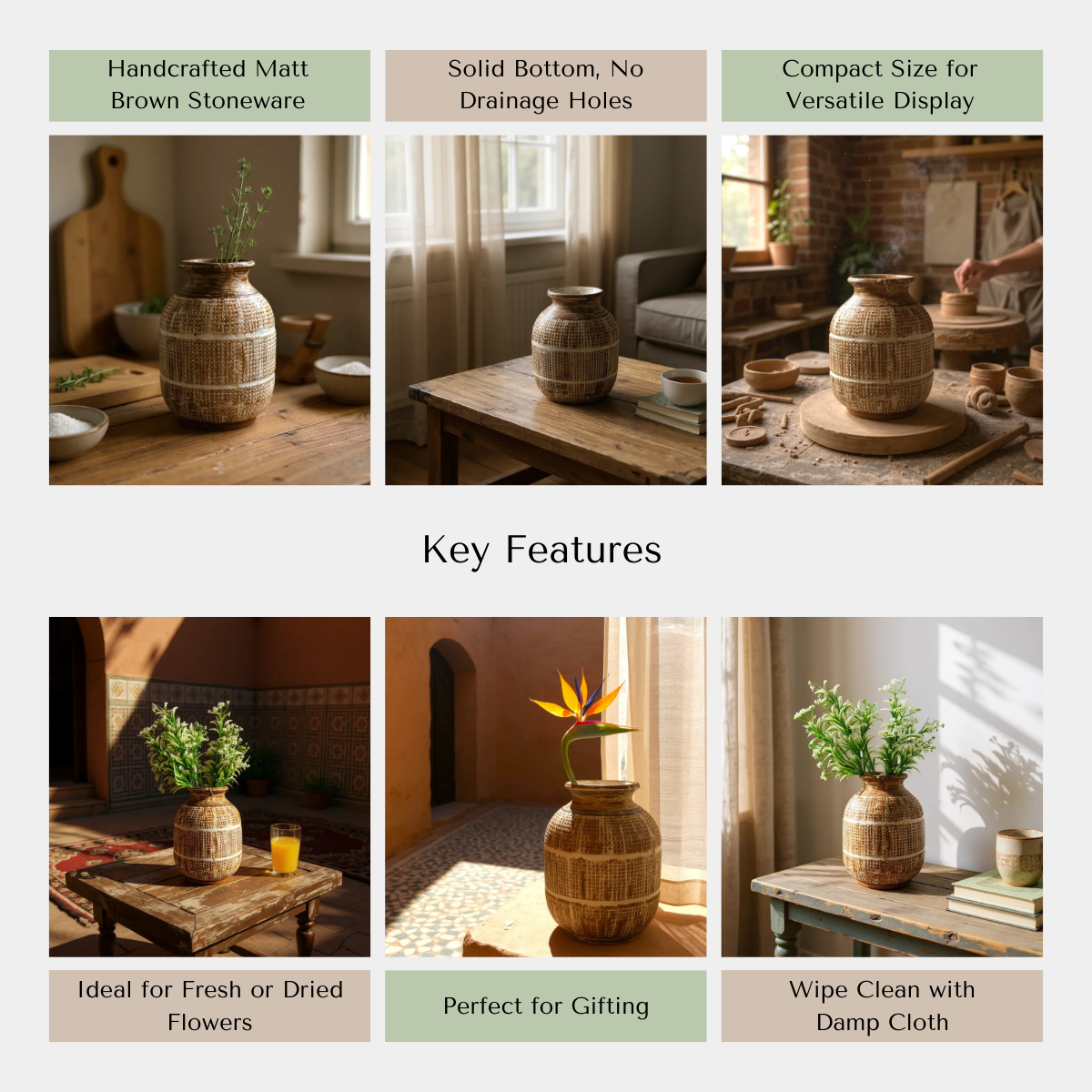 Enhance your living space with the Woodland Whisper Vase, a beautifully handcrafted stoneware piece with a warm, rustic brown glaze. Its timeless shape combined with an intricate textured pattern creates a unique artisanal feel that adds both character and charm to any room. The matt finish reflects light subtly, amplifying the vase's earthy tones and intricate details.