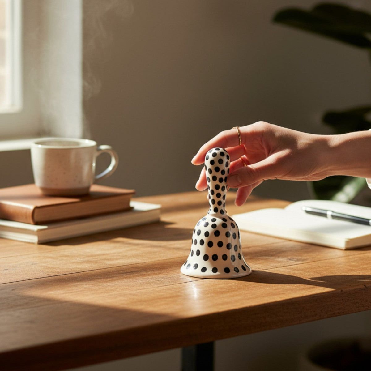 Add a pop of personality to your space with the Dottie Table Bell — a hand-painted ceramic bell with bold black polka dots on a crisp white base. Designed to delight, this whimsical bell doubles as a unique table accessory and conversation starter, perfect for brightening up kitchens, coffee nooks, or breakfast trays. Functional and fun, the Dottie Table Bell makes a charming addition to brunches, tea parties, or as a cheerful gift for any occasion.