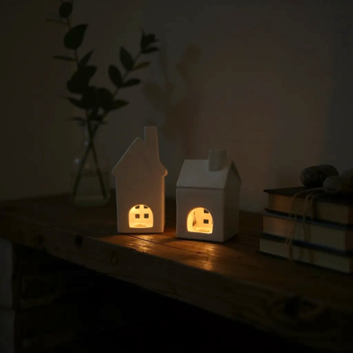 • Set of 2 ceramic tealight holders in cottage shapes