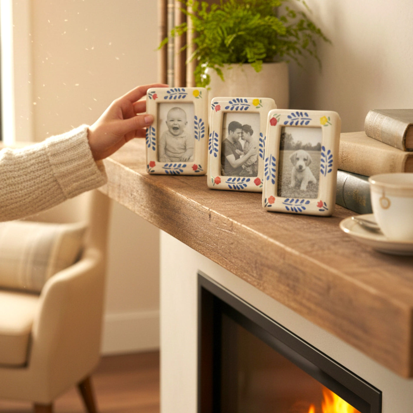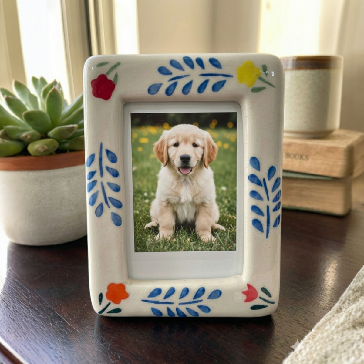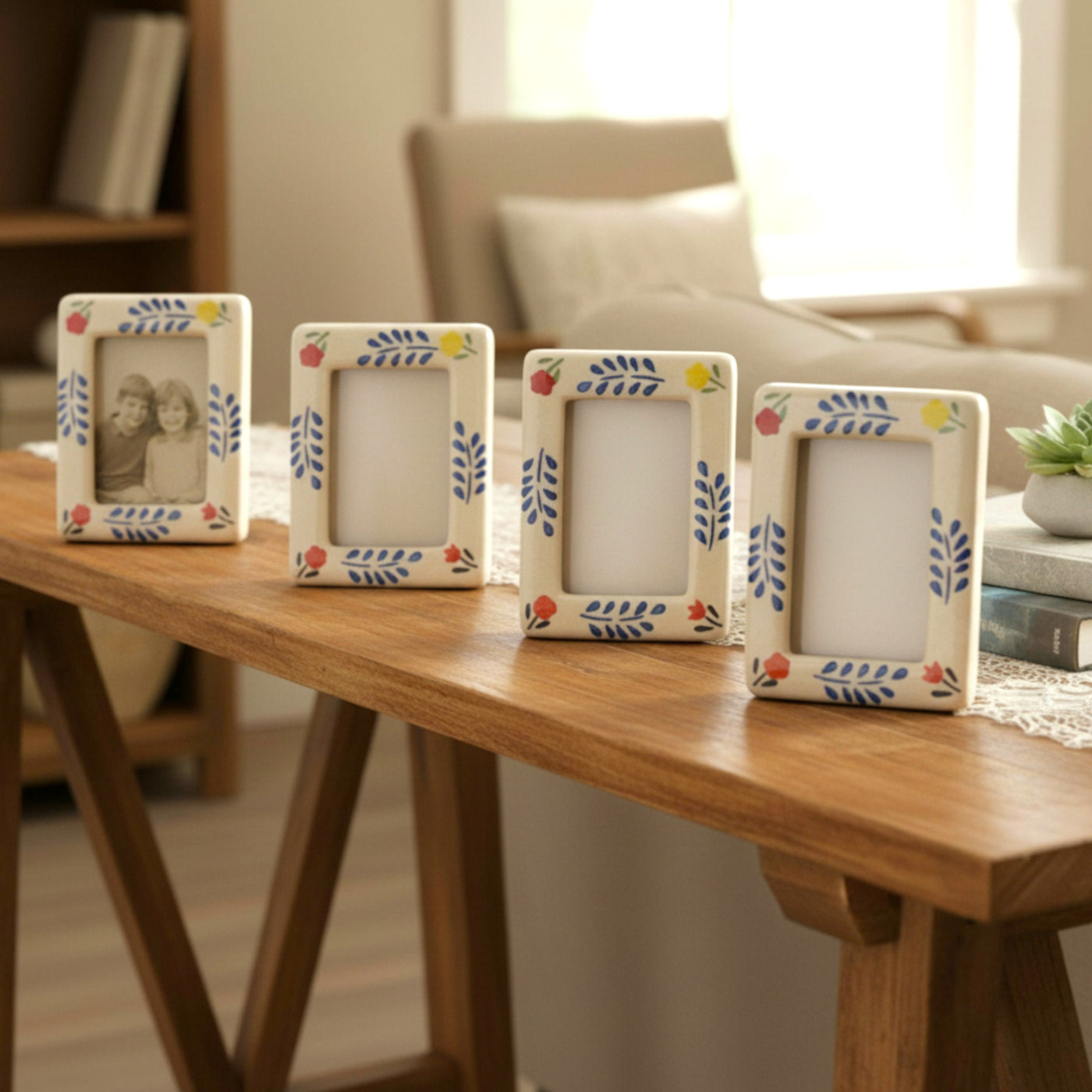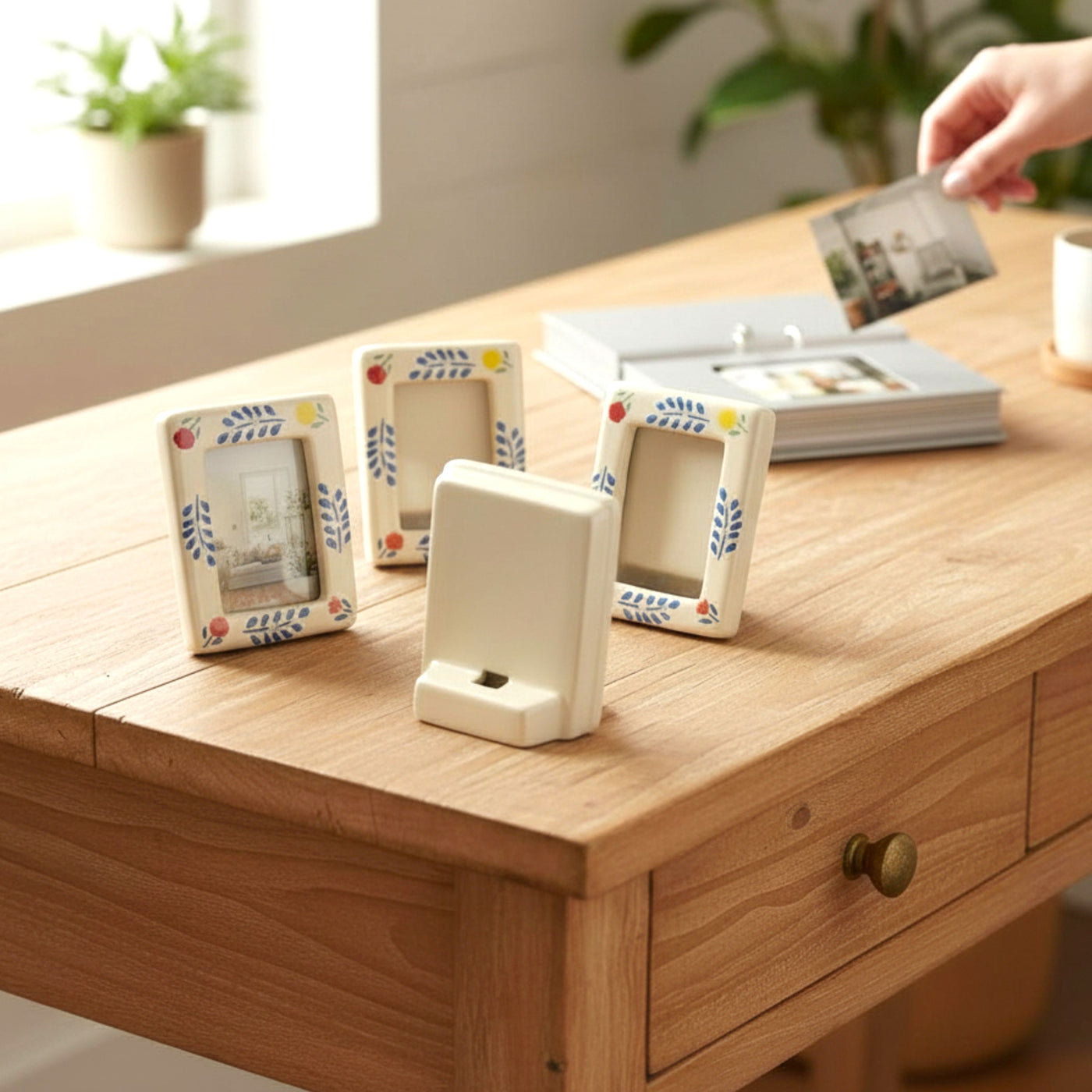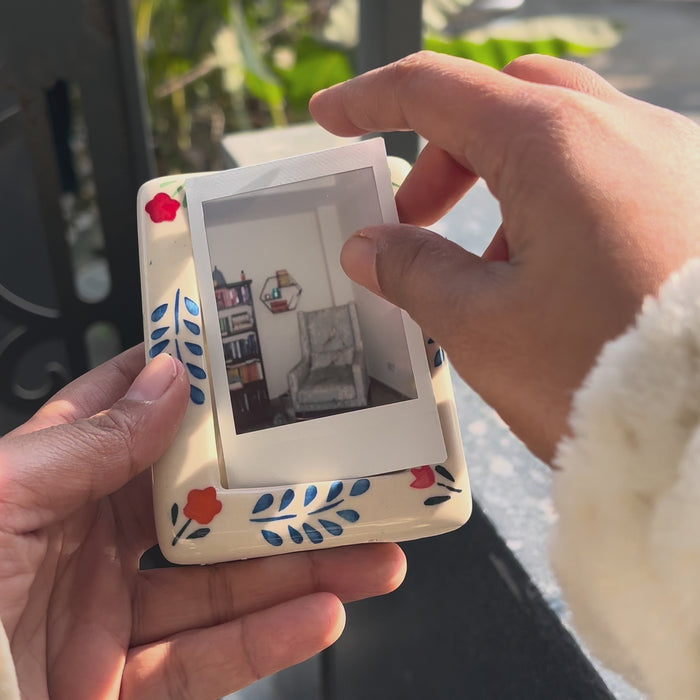 Freeze your favorite moments in time with the Polaroid Time Capsule Frames (Set of 4), thoughtfully designed to mimic the nostalgic charm of polaroid photographs. Each ceramic frame features a clean rectangular window surrounded by hand-painted floral and foliage motifs, adding a playful yet refined touch to any corner of your home. Display them together as a coordinated set or style them individually across rooms to create a cohesive, memory-filled decor story that feels warm, personal, and inviting.