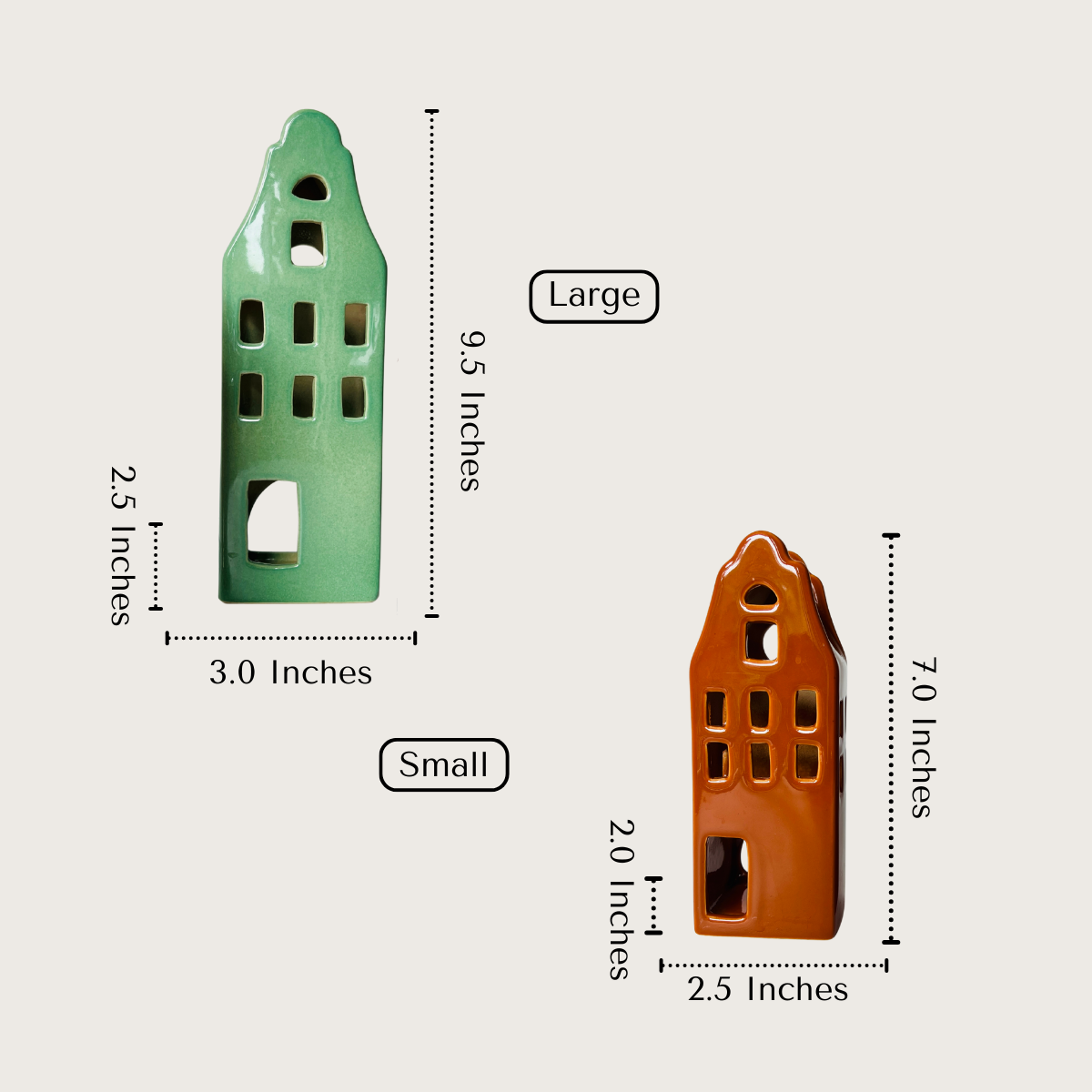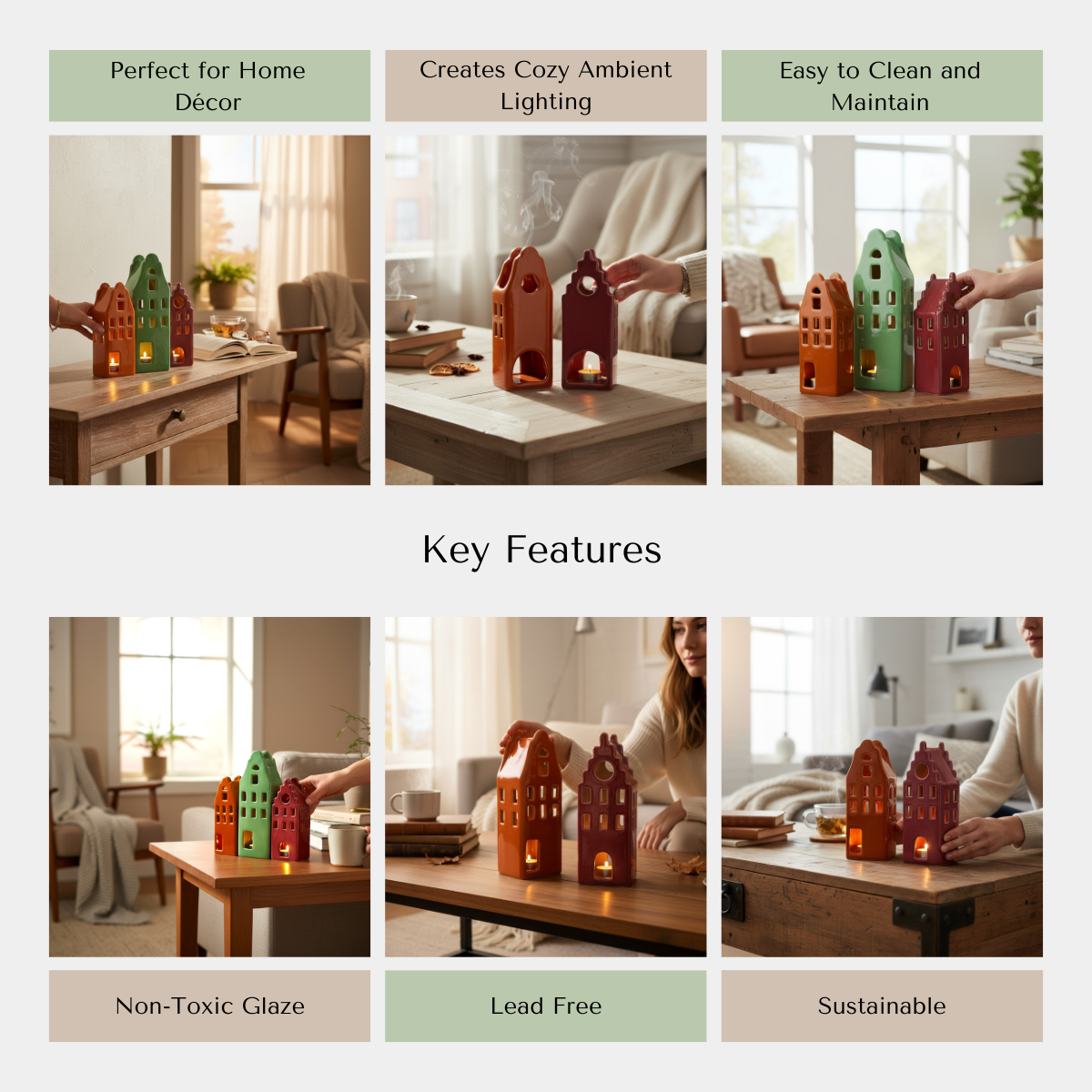 Illuminate your living space with the charming Amsterdam Tealight Houses set. This handcrafted duo features three cottage-shaped tealight holders made from durable ceramic, each beautifully glazed in warm, glowing tones. Designed to create a cozy ambiance, these cottages emit a soft, flickering light that adds a magical touch to your home décor, perfect for tabletops, shelves, or as a thoughtful gift.