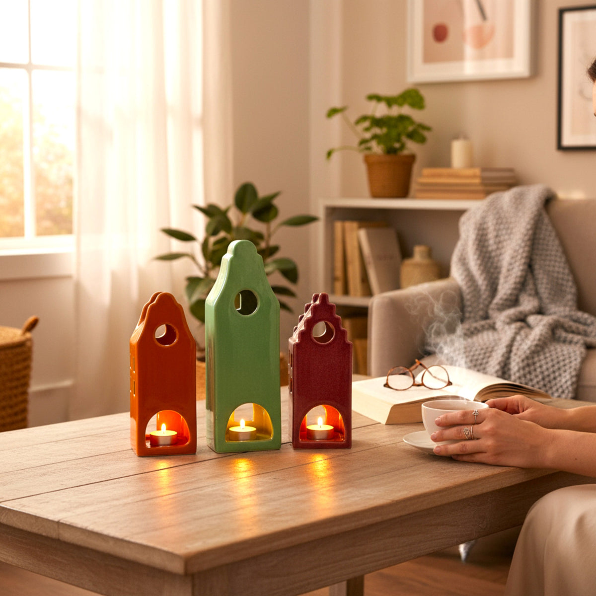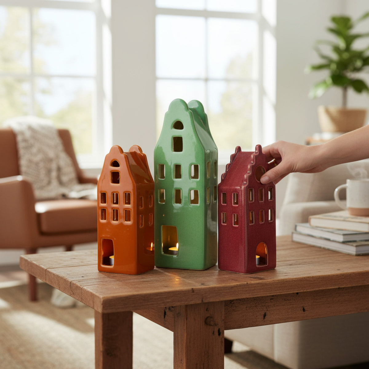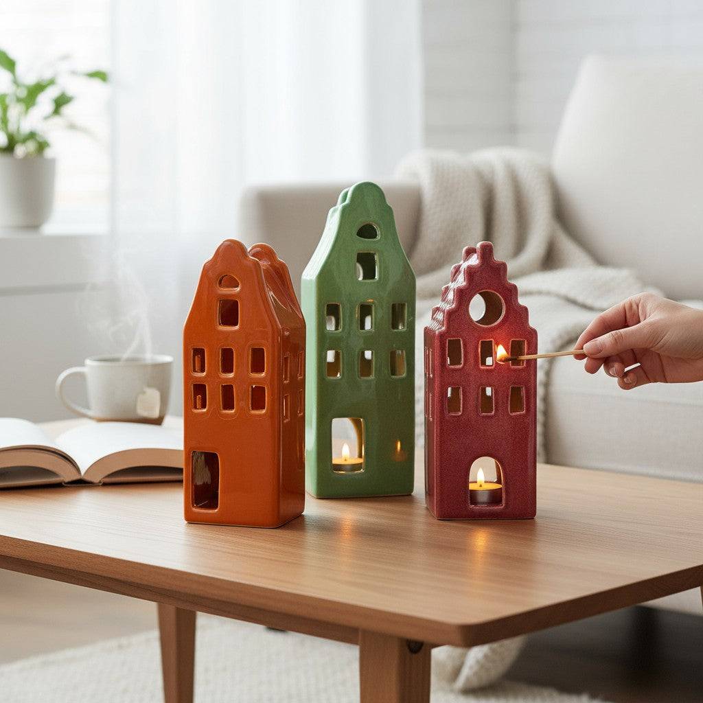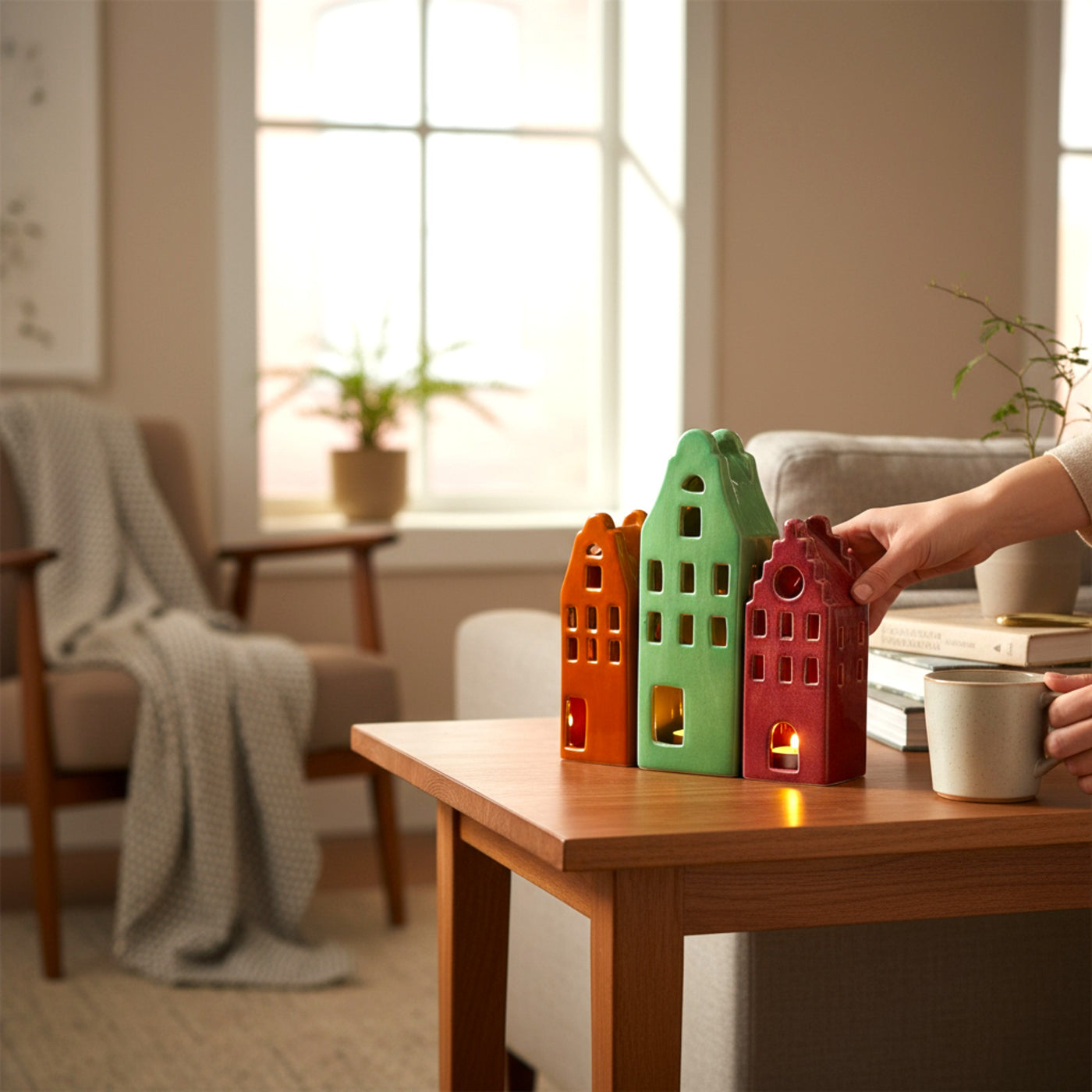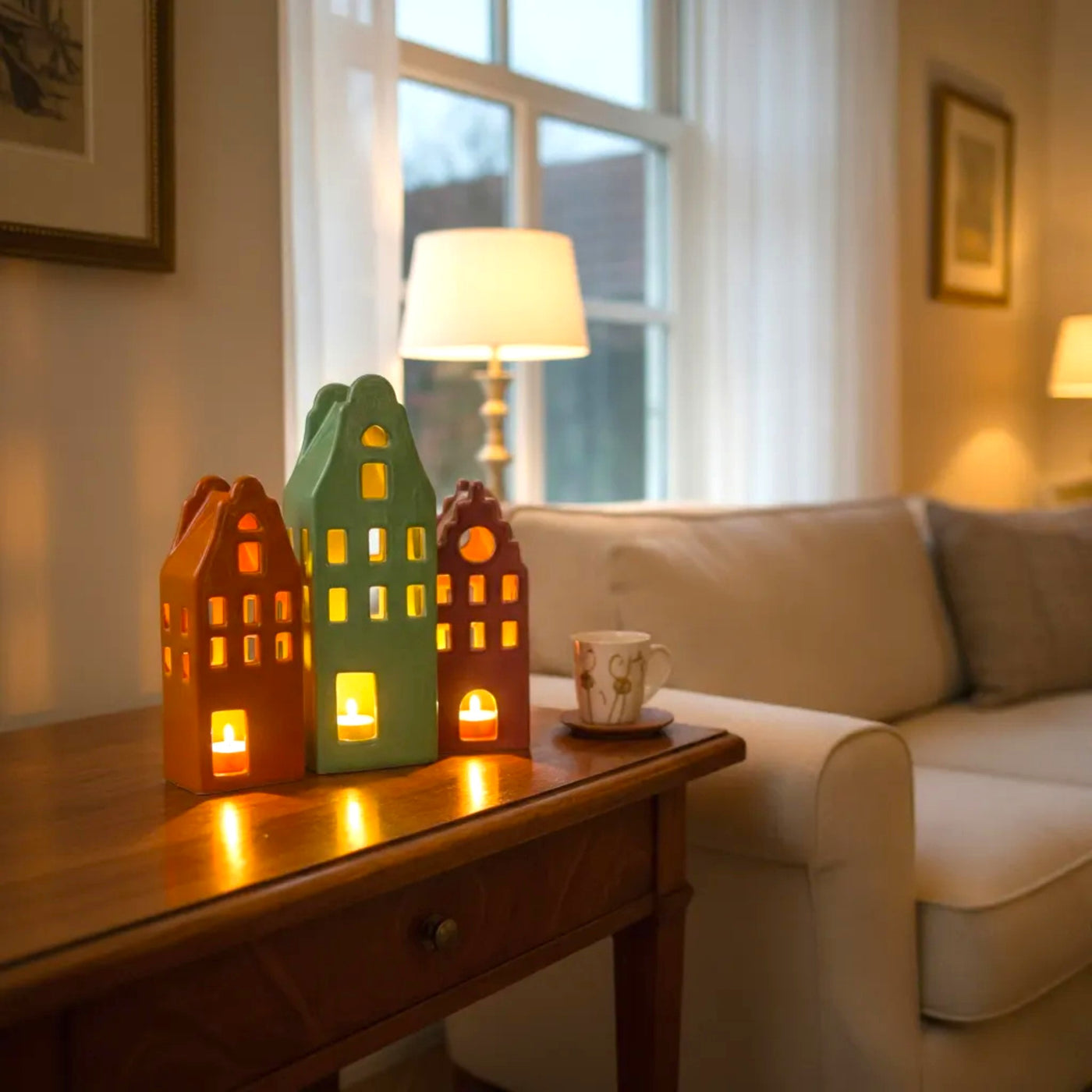 Bring warmth and enchantment to any room with the Amsterdam Tealight Houses set - where artisan craftsmanship meets comforting light for a truly inviting atmosphere.