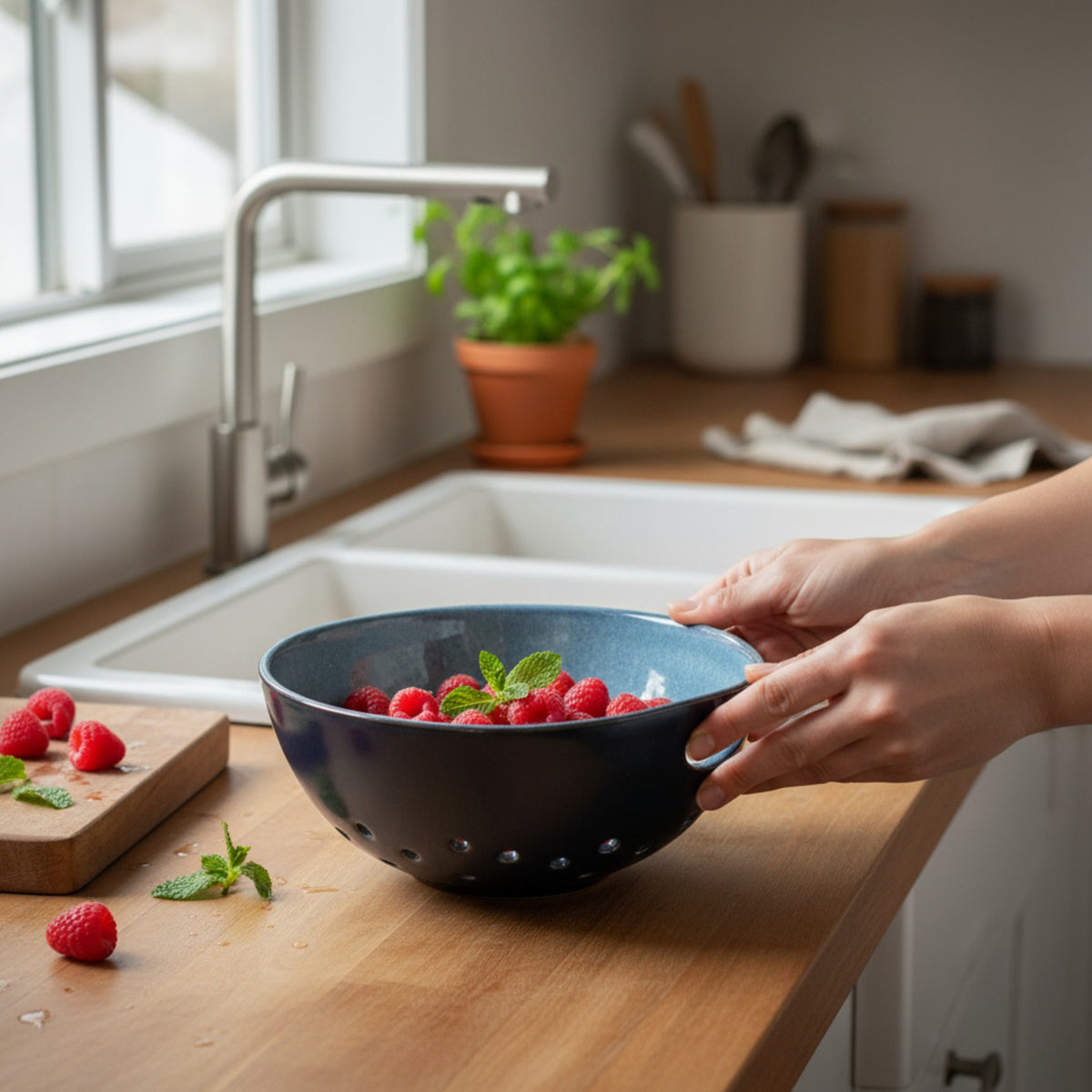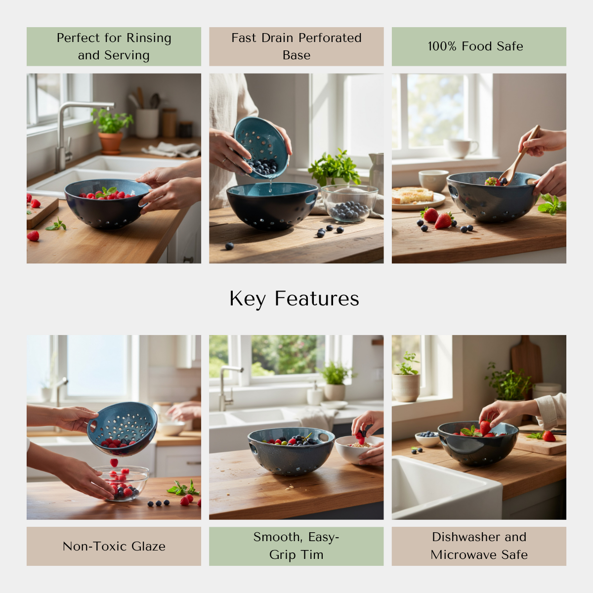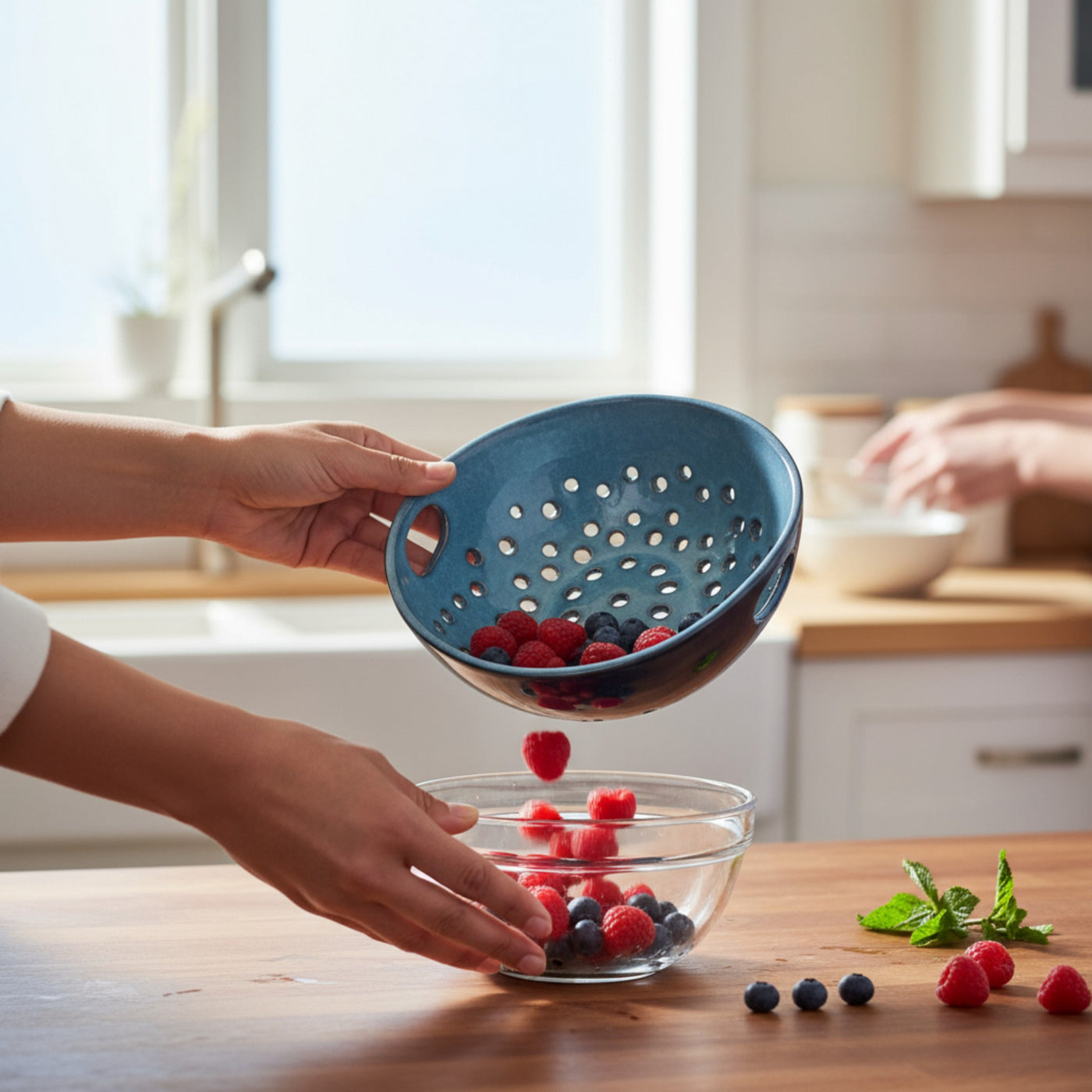 Brighten your kitchen with the Meadow Berry Strainer — a handcrafted ceramic colander designed for effortless rinsing and serving of berries, grapes, or cherry tomatoes. Its artisan-glazed finish and perfectly placed drainage holes combine style with everyday practicality. Durable, food-safe, and beautiful enough to display, this strainer is a must-have for fruit lovers and farmhouse enthusiasts alike.