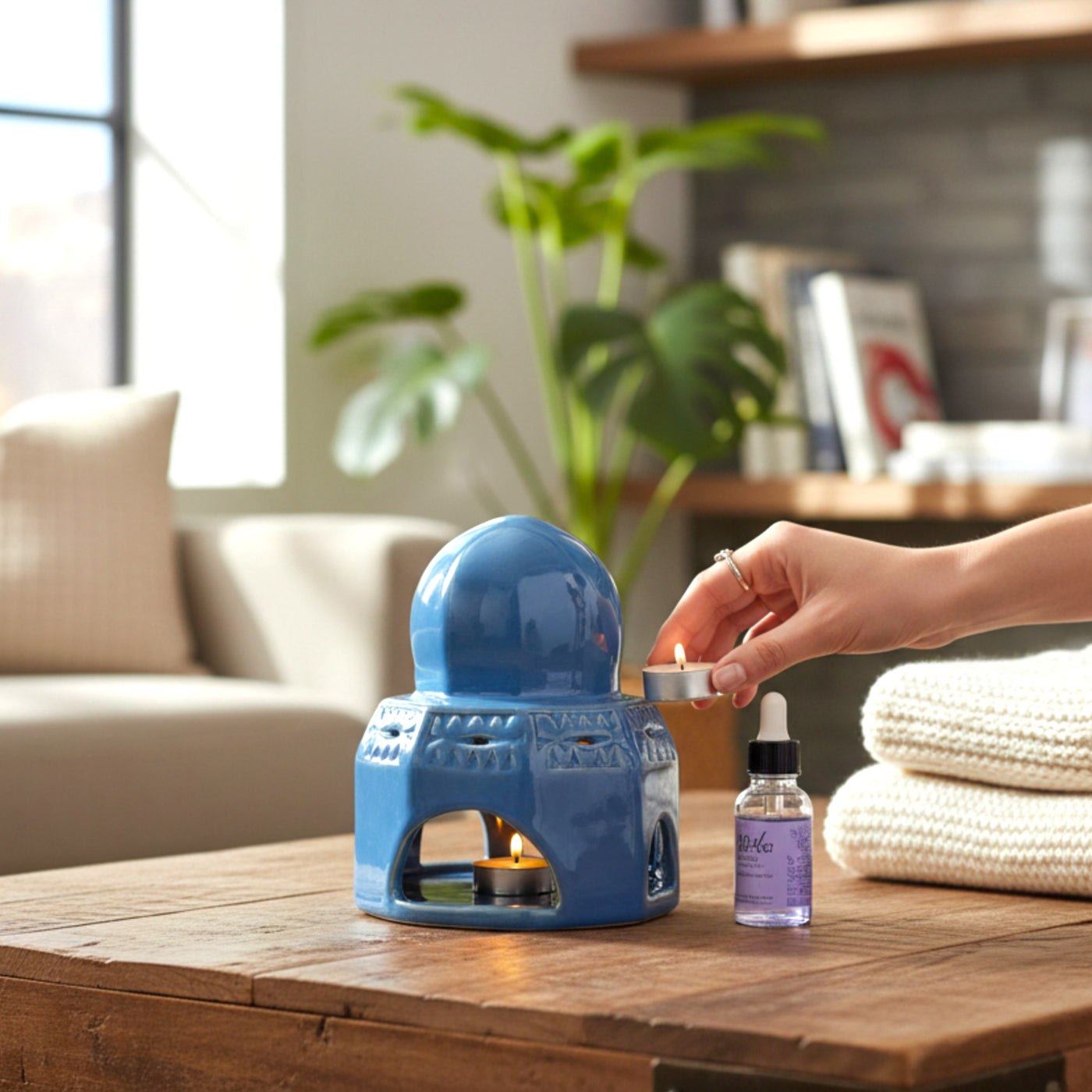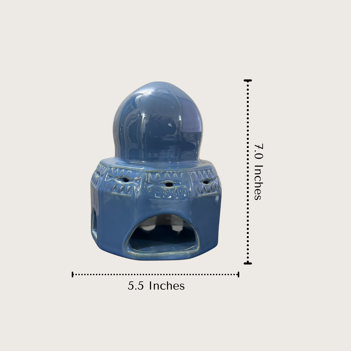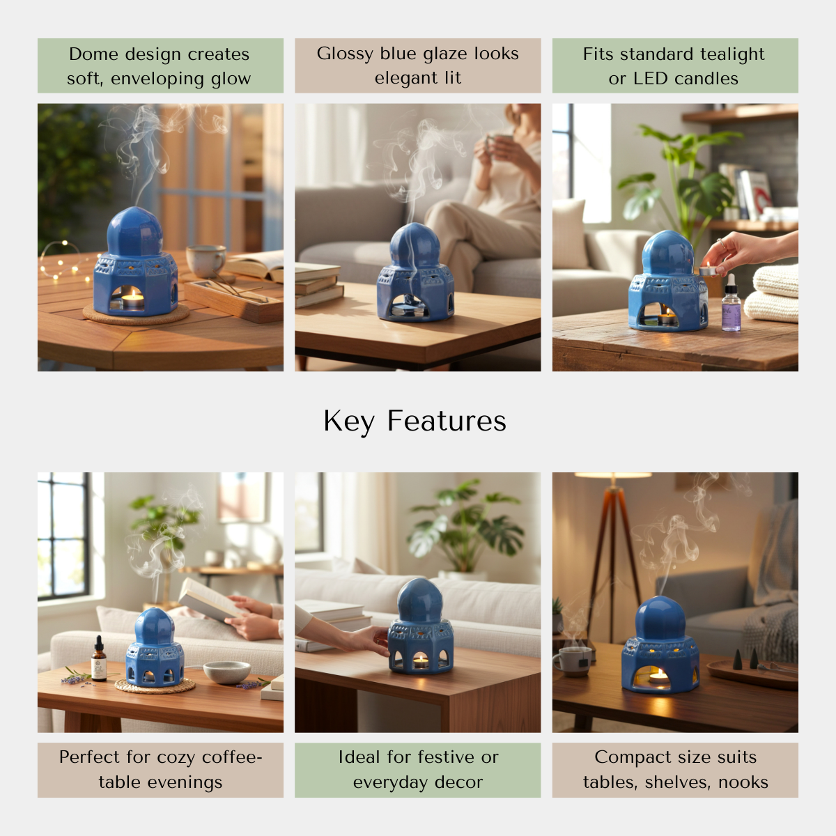 - Finish: Glossy, glazed blue finish with subtle reflections that enhance the play of tealight candle